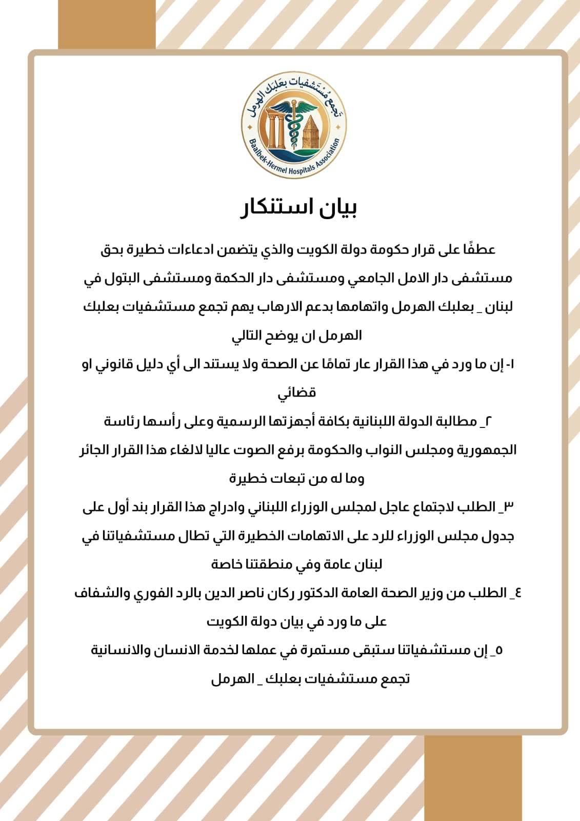وفي السياق نفسه، صدر عن تجمع مستشفيات بعلبك – الهرمل بيان استنكار، تعليقًا على قرار صادر عن حكومة دولة الكويت تضمّن ادعاءات خطيرة بحق مستشفى دار الأمل الجامعي ومستشفى دار الحكمة ومستشفى البتول في منطقة بعلبك – الهرمل، واتهامها بدعم الإرهاب.